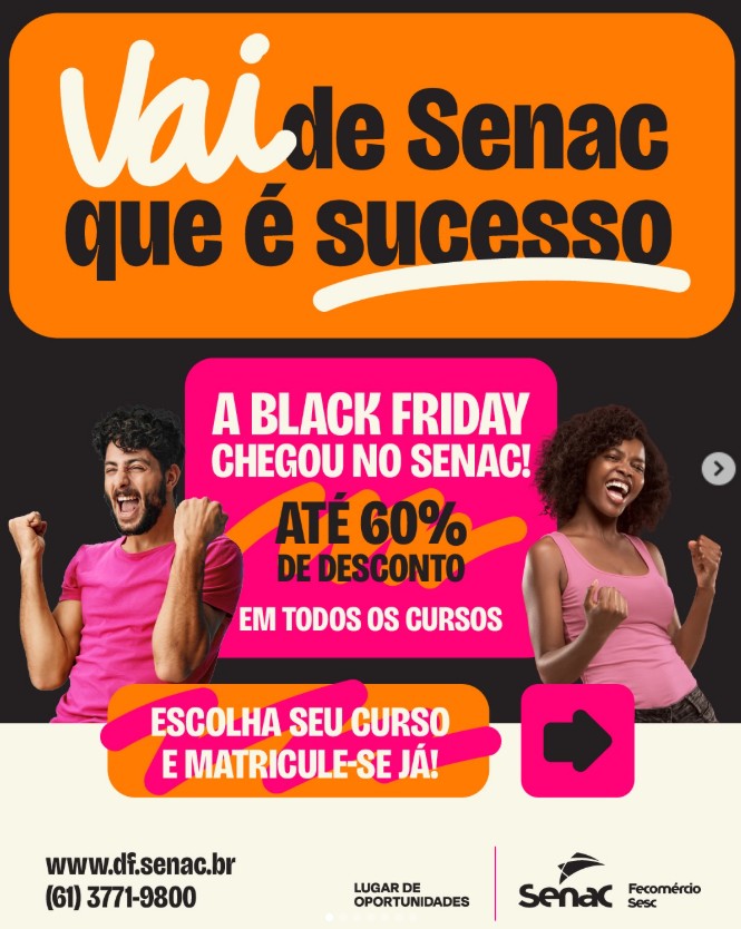 O Senac-DF está com oportunidades imperdíveis de qualificação profissional durante a Black Friday. São diversas vagas em cursos técnicos e profissionalizantes com descontos que chegam a 60% no primeiro semestre ou até 25% no curso inteiro, dependendo da área escolhida. É a chance de investir na carreira, conquistar novas oportunidades e se preparar para o mercado de trabalho com uma instituição reconhecida pela excelência em educação profissional.