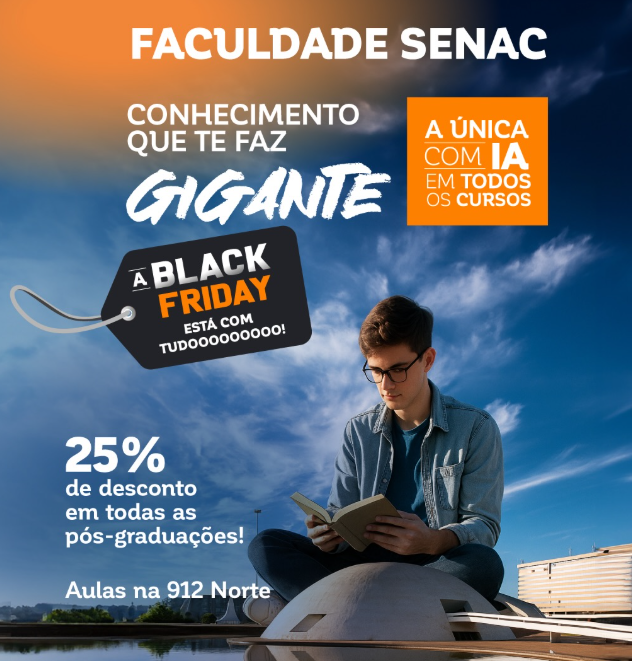A Faculdade Senac-DF lançou sua promoção de Black Friday com descontos de 25% em todas as pós-graduações, incentivando profissionais a investirem na qualificação e no desenvolvimento de carreira. As matrículas podem ser feitas pelo site www.df.senac.br.