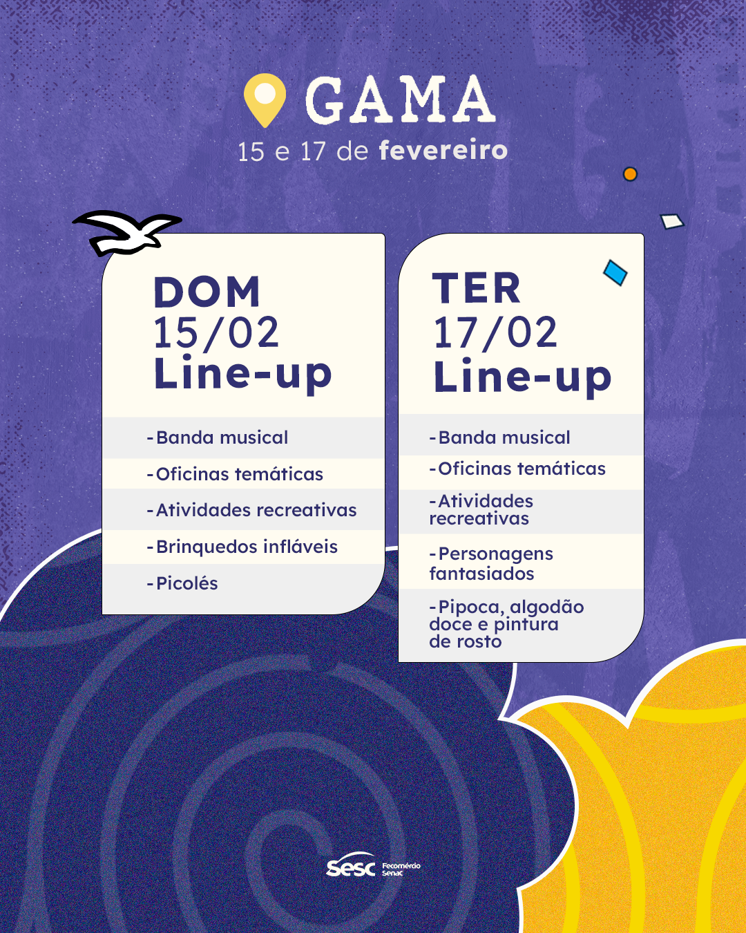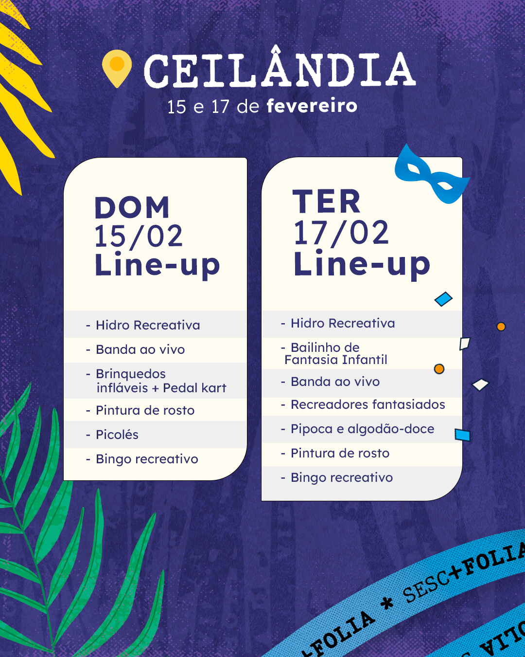 O Sesc Folia 2026 reforça o compromisso do Sesc-DF em promover cultura, lazer e convivência social, oferecendo um Carnaval seguro, acessível e acolhedor para famílias e amigos celebrarem juntos.