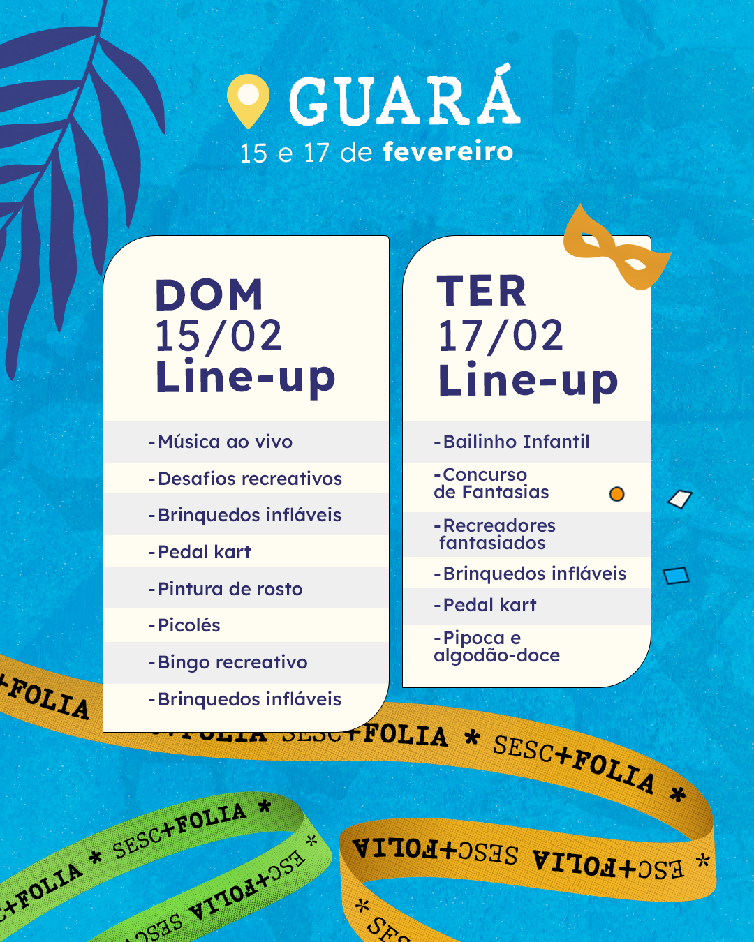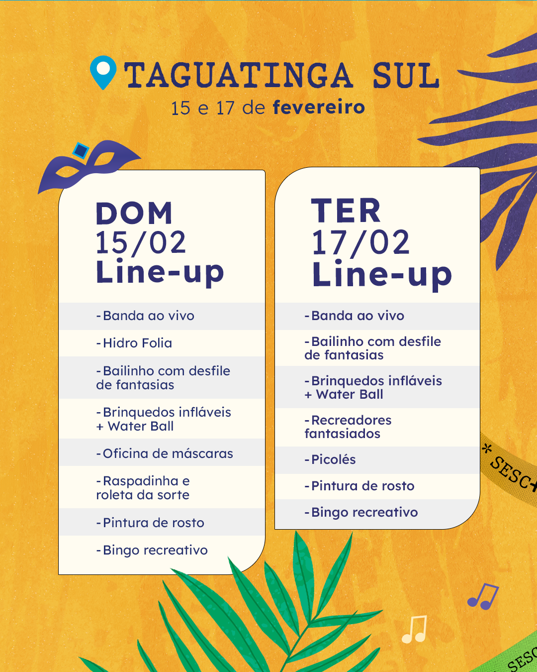 Durante os dois dias de festa, o público poderá curtir atividades recreativas, brincadeiras carnavalescas e bandas ao vivo, que vão embalar a folia com grandes clássicos do Carnaval, convidando todo mundo a dançar. Além disso, os frequentadores terão acesso completo à área de lazer das unidades, incluindo quadras esportivas, piscinas e salões de jogos, garantindo diversão do começo ao fim.