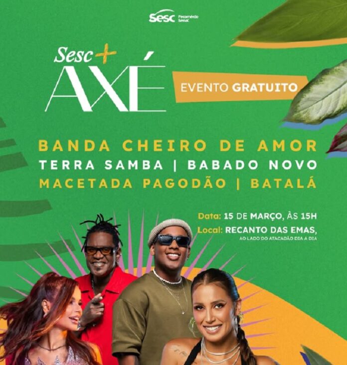 A ressaca de Carnaval já tem data, local e atrações confirmadas. O Sesc + Axé divulgou o line-up oficial do evento, que será realizado no próximo dia 15 de março, no Recanto das Emas, ao lado do Atacadão Dia a Dia, prometendo reunir fãs do gênero em uma grande celebração gratuita.