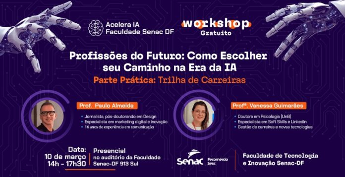 A Faculdade Senac-DF realiza, no dia 10 de março, o Workshop Profissões do Futuro: Trilha de Carreiras. Gratuito e com vagas limitadas, o evento ocorre das 14h às 17h30, no auditório da unidade 913 Sul e é voltado a estudantes que estão em fase de decisão profissional.