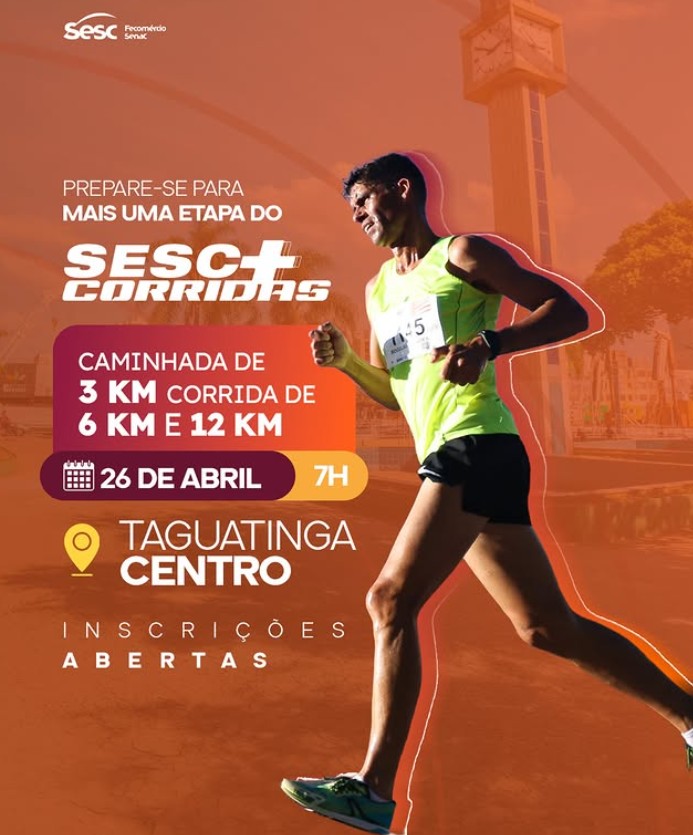 A etapa Taguatinga do Sesc+Corridas já tem data definida e promete movimentar a cidade com esporte e qualidade de vida. A prova será realizada no dia 26 de abril, com largada prevista para as 7h, em Taguatinga Centro, nas proximidades do viaduto de Taguatinga, no Setor C Norte.